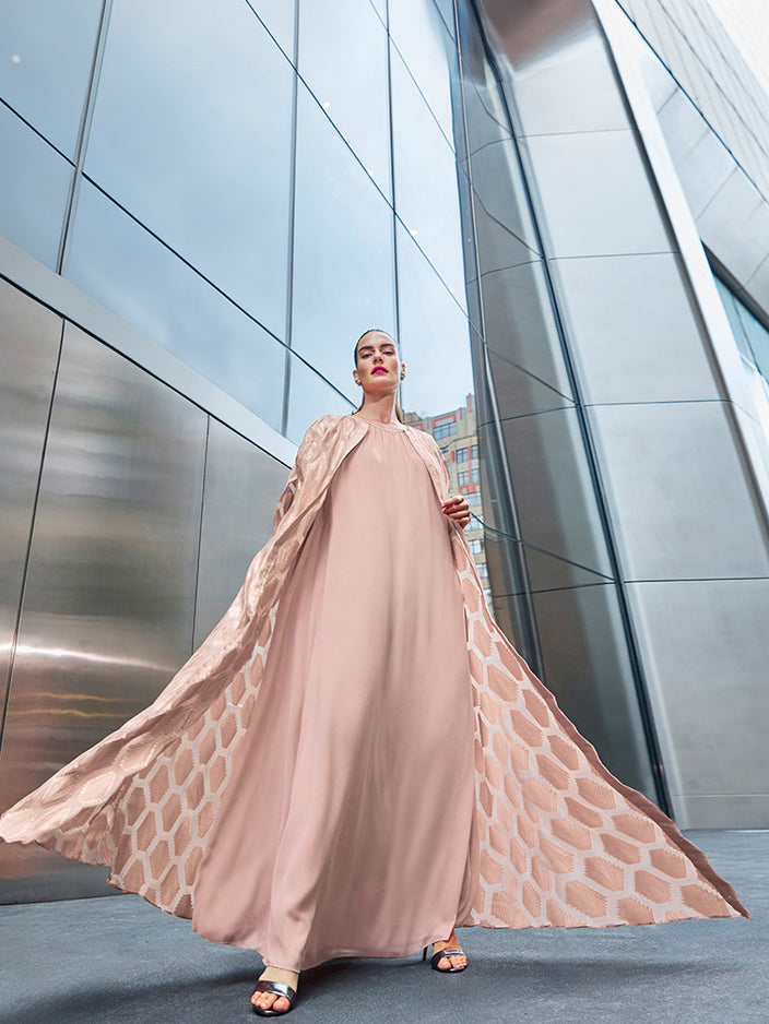 The cape, a women’s wardrobe classic, is updated with a modern twist, offered as a long jacquard duster coat, as a tunic to pair with flowing trousers, and finally, as a dress in iridescent gauze with a sequin and lamé mesh yoke, perfect for a special evening, an event, or a Gala.