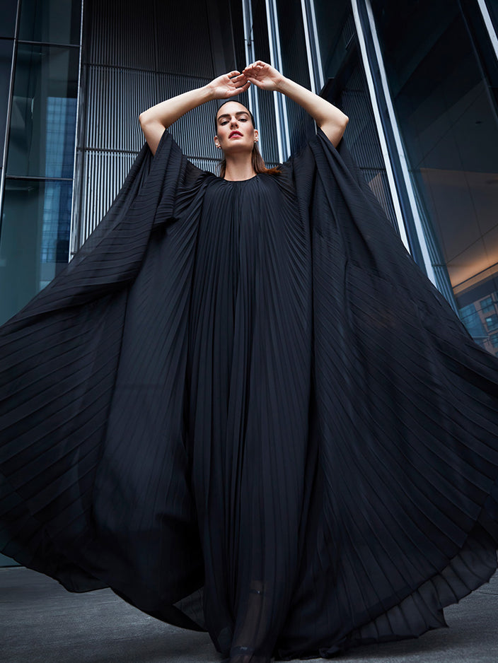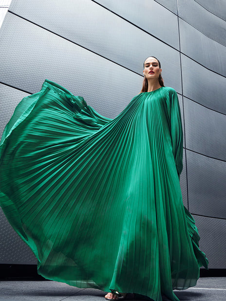 An iconic detail from the 1920s, pleating is reinterpreted with a contemporary feel, transforming into a new georgette peplos, or an extremely feminine iridescent jersey dress that reveals the shoulders.