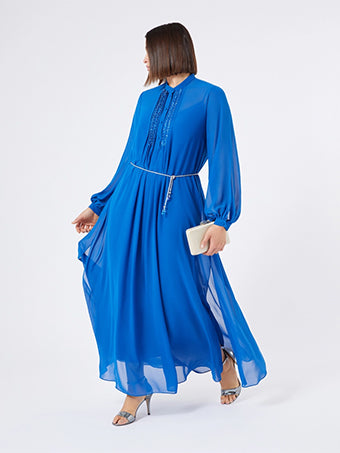 The deep pleats amplify the movement of the skirt, while the jewel buttons add sparkle and sophistication.