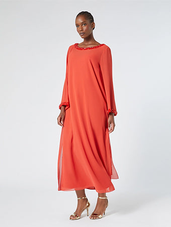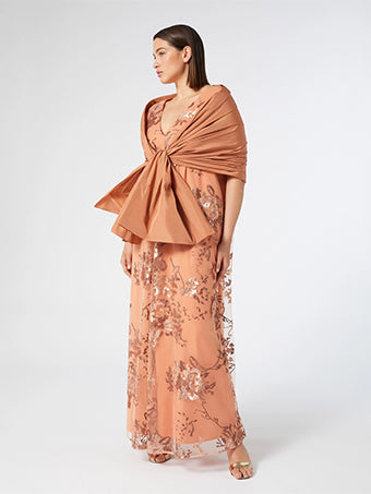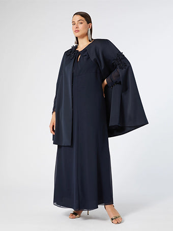 The yoke is fully adorned with hand-applied fabric and jet flowers, while raised textures beautifully embellish the neckline. The ideal pick for anyone seeking a formal dress that is both elegant and eye-catching.