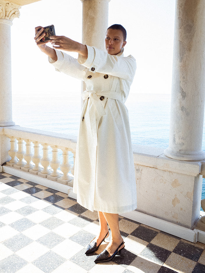 I wake up in the morning, put on a white duster coat and go out to get a freshly baked baguette for breakfast on the terrace. A polka-dot dress for a long barefoot walk on the beach, followed by a trip to the flower market. And a stylish, semi-sheer black shirt dress for an aperitif at the yacht club. On Sunday, a lovely double-breasted suit in a sand-colour, of course, is just the thing for a stroll around the art gallery I always enjoy so much.