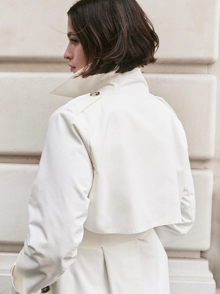 For example, a cotton-blend twill trench coat, like the white or dark green one, can be easily paired with trainers and jeans or cigarette trousers, for a modern, natural effect.