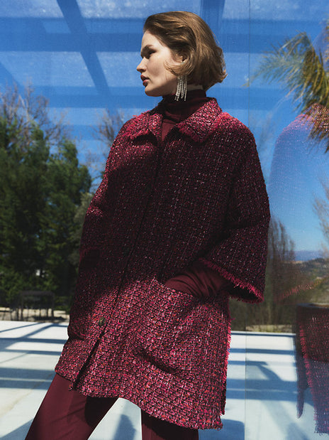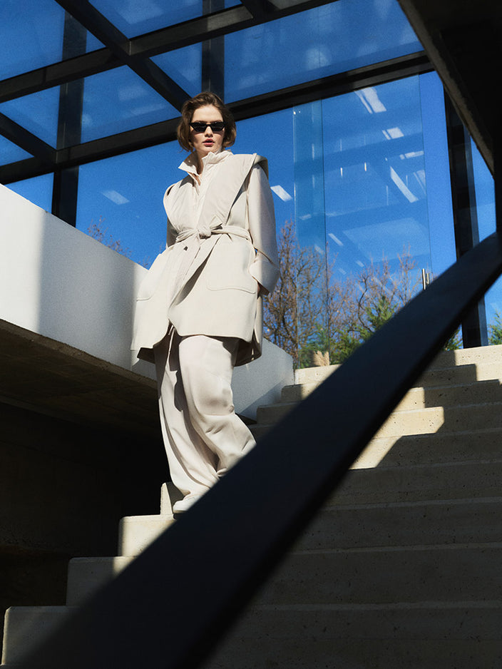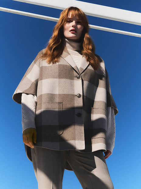The beauty of the cape also lies in its versatility, which is expressed through materials and small details. If you're looking for a sophisticated look, the is the right choice: with lapels and side slits, it combines the cape cut with the elegance of a neutral color. For a more structured touch of class, the is perfect, with its sartorial double-breasted design and fluid line that adapts to every figure.