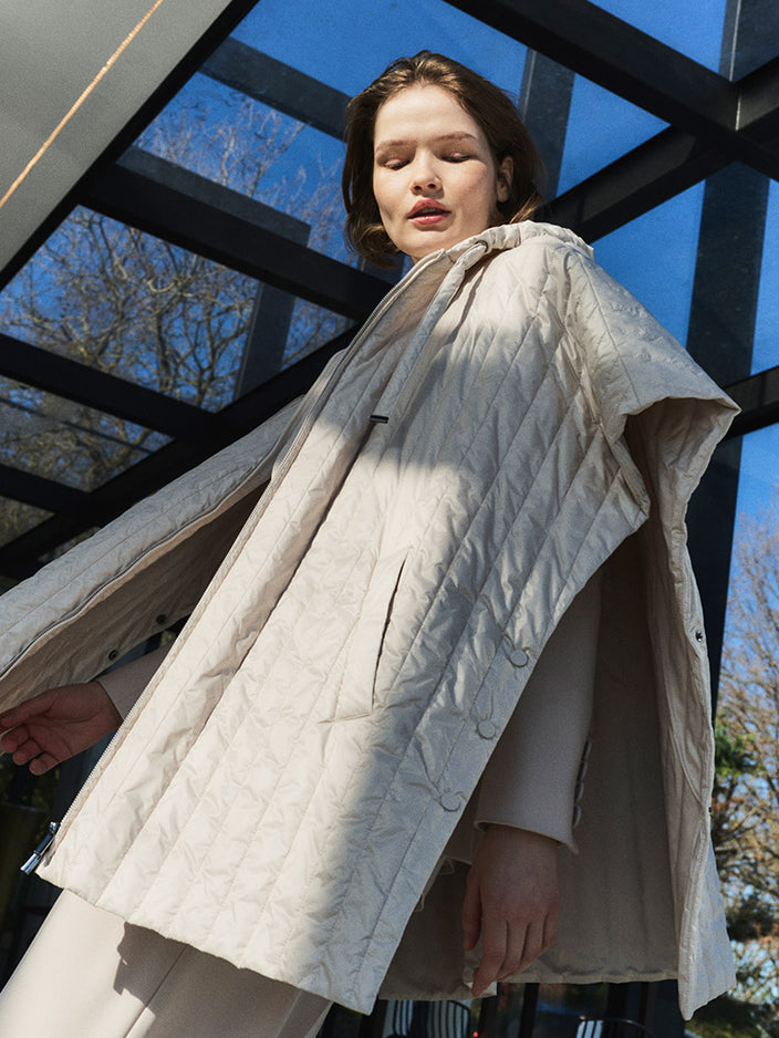 But the cape can also be super practical. If your style is more urban and dynamic, the in rainproof fabric with thermal padding is ideal for colder days. The adjustable hood and double zip add that touch of functionality that never makes you give up on style. And for mid-season, the with hood and belt is the garment that allows you to combine sporty comfort with elegance.